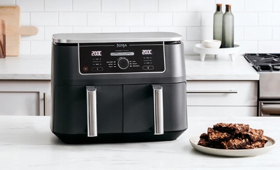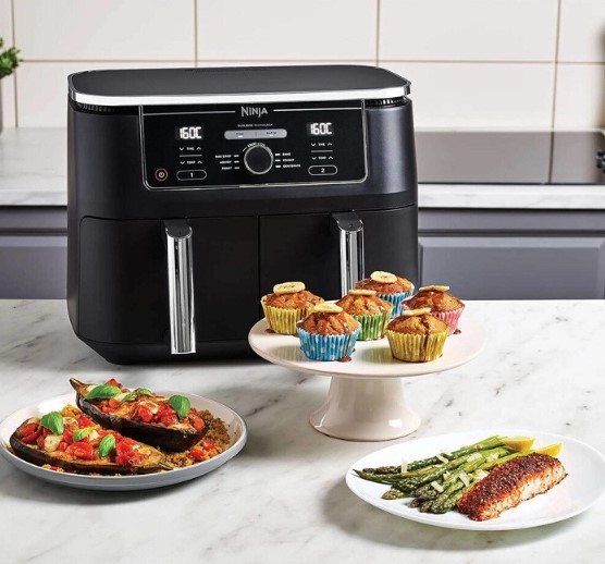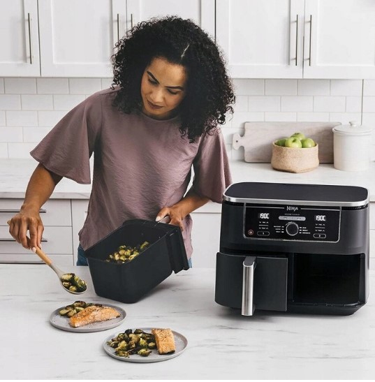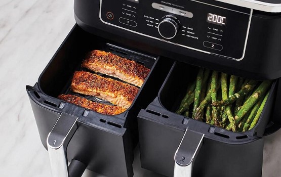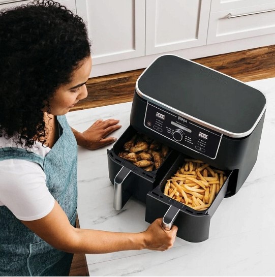 „Ninja Foodi AF400EU XXL“ oro gruzdintuvė su dviem nepriklausomomis 4,75 l talpos krepšeliais leidžia vienu metu ruošti du patiekalus – mėsą, daržoves, bulvytes ar kitus patiekalus. Kepimas karštu oru padeda sumažinti riebalų kiekį iki 75 %, išlaikant traškų ir gardų skonį.