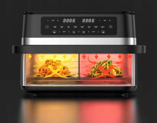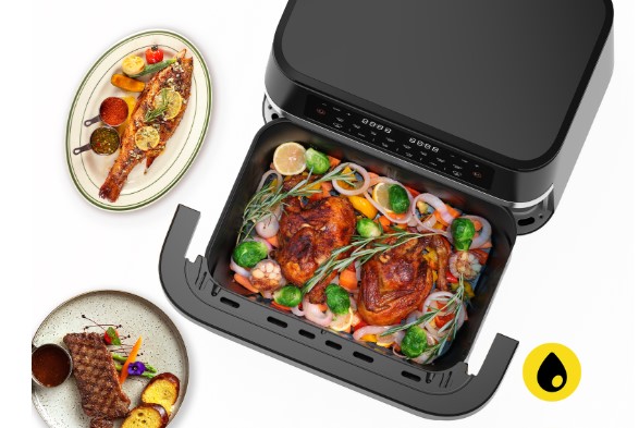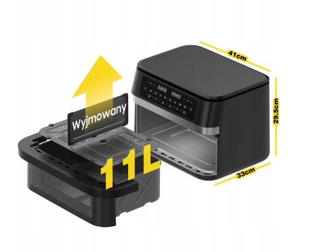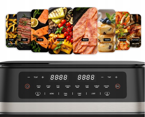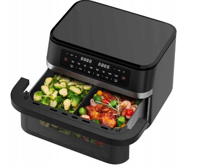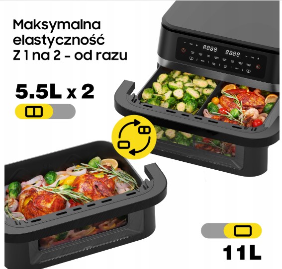 Atraskite naują gaminimo patirtį su XXL 11 litrų talpos oro gruzdintuve, kuri sujungia galingumą, patogumą ir modernias funkcijas viename įrenginyje. Dviejų zonų sistema leidžia gaminti skirtingus patiekalus vienu metu, o nuimamas pertvaras suteikia dar daugiau lankstumo – vienu metu galėsite ruošti tiek dvigubas porcijas, tiek didelius maisto gabalus.