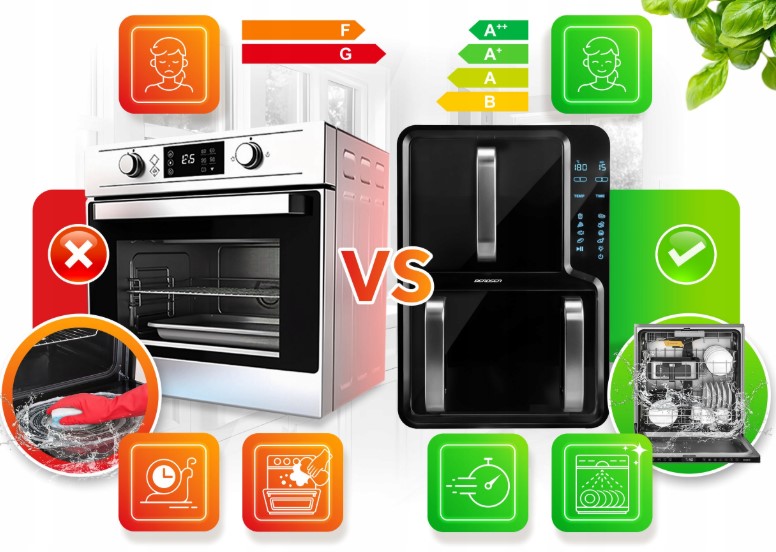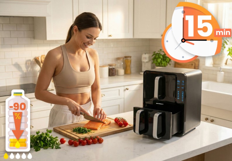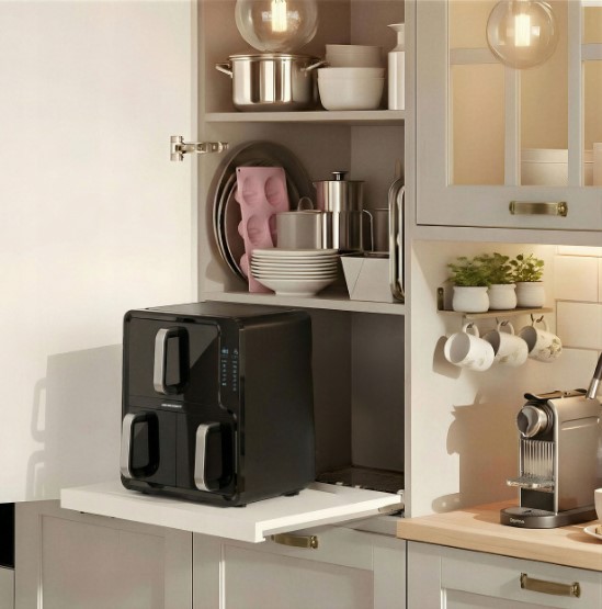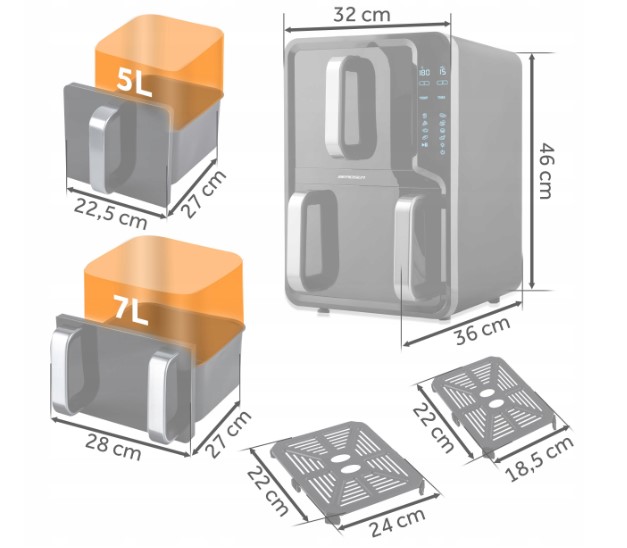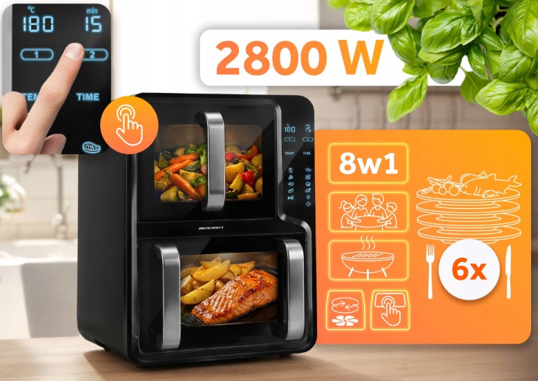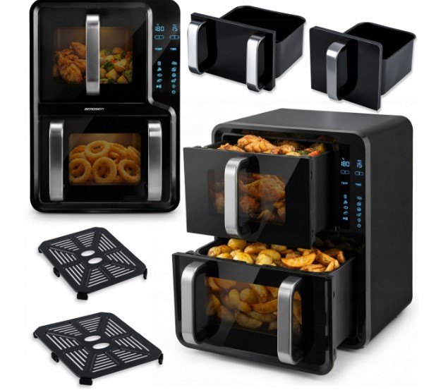 - Tipas: dviejų kamerų karšto oro gruzdintuvė (air fryer)