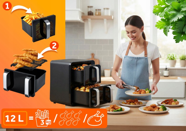 Prietaisas turi dviejų kamerų sistemą, kurią sudaro 5 litrų ir 7 litrų talpos kepimo zonos. Tai suteikia galimybę gaminti skirtingus patiekalus vienu metu, pavyzdžiui, pagrindinį patiekalą ir garnyrą. Bendra 12 litrų talpa yra pakankama visai šeimai ar didesniems patiekalams ruošti, todėl įrenginys puikiai tinka tiek kasdieniam naudojimui, tiek svečių priėmimui.