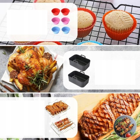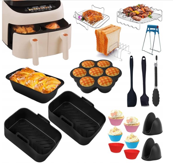 13 dalių priedų rinkinys karšto oro gruzdintuvei (Air Fryer) – universalus sprendimas patogesniam ir įvairesniam gaminimui. Tinka Ninja Dual Basket ir kitoms 7,6–9,5 l talpos gruzdintuvėms. Rinkinyje rasite kepimo formas, silikoninius įdėklus, stovelius bei kitus priedus, kurie padės lengviau ruošti maistą ir palaikyti švarą. Idealu kasdieniam naudojimui ir naujų receptų išbandymui.