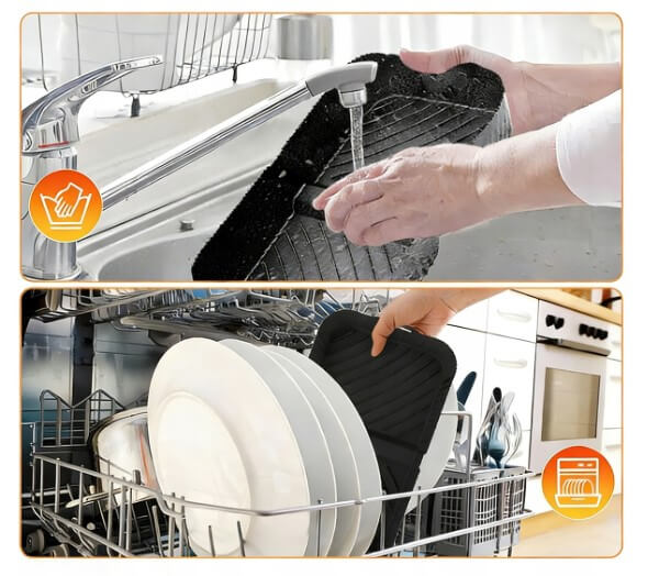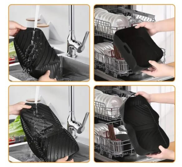 - Aukštesni ir didesni silikoniniai įdėklai – 3 cm aukštesni nei įprasti, lengvai išimami, apsaugo nuo aliejaus purslų, talpina daugiau maisto.