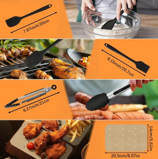 - Universalumas ir praktiškumas – įdėklai puikiai tinka skirtingiems produktams kepti, grotelės su iešmeliais pravers ruošiant daržoves ar mėsą, šepetėlis palengvina prieskonių paskirstymą.