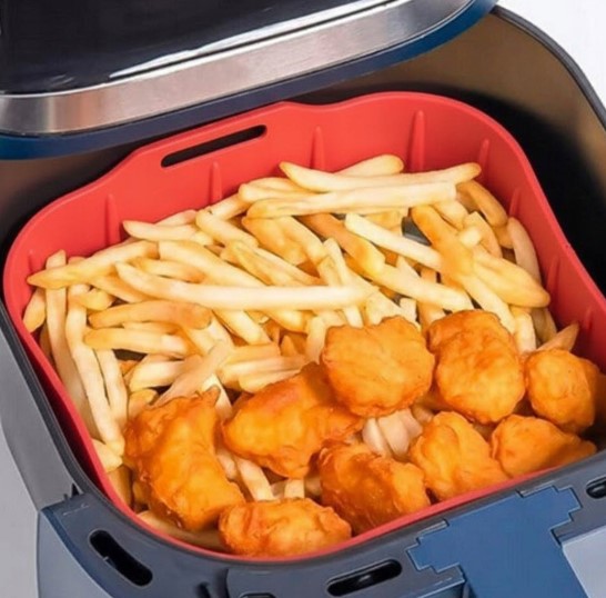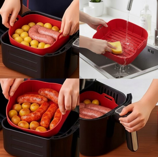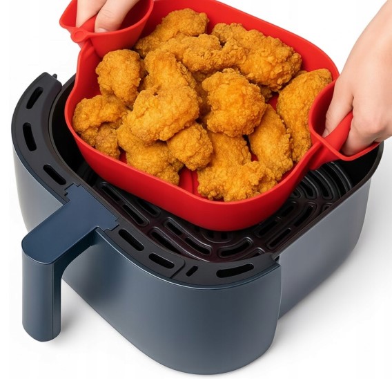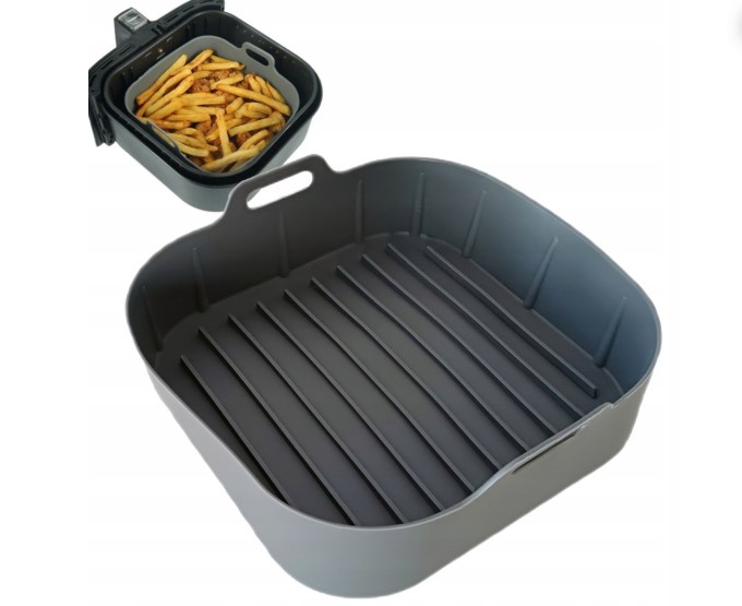 Silikoninė forma karšto oro gruzdintuvei skirta patogiam ir sveikesniam kasdieniam maisto gaminimui. Ji leidžia kepti be aliejaus arba naudojant minimalų jo kiekį, išlaikant natūralų maisto skonį ir tekstūrą.