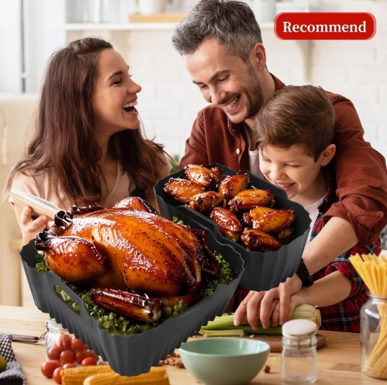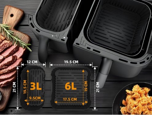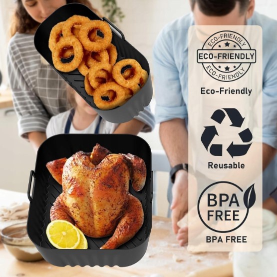 Įdėklai pagaminti iš maistinio silikono, atsparaus iki 230 °C temperatūrai, be BPA ir saugaus sveikatai. Lanksti ir patvari medžiaga užtikrina ilgaamžiškumą, o nelimpantis paviršius leidžia maistui neprilipti ir išlaikyti gerą tekstūrą. Šie silikoniniai kepimo įdėklai tinka daugumai dvigubo krepšelio tipo karšto oro gruzdintuvių, todėl yra universalus pasirinkimas kasdieniam naudojimui.